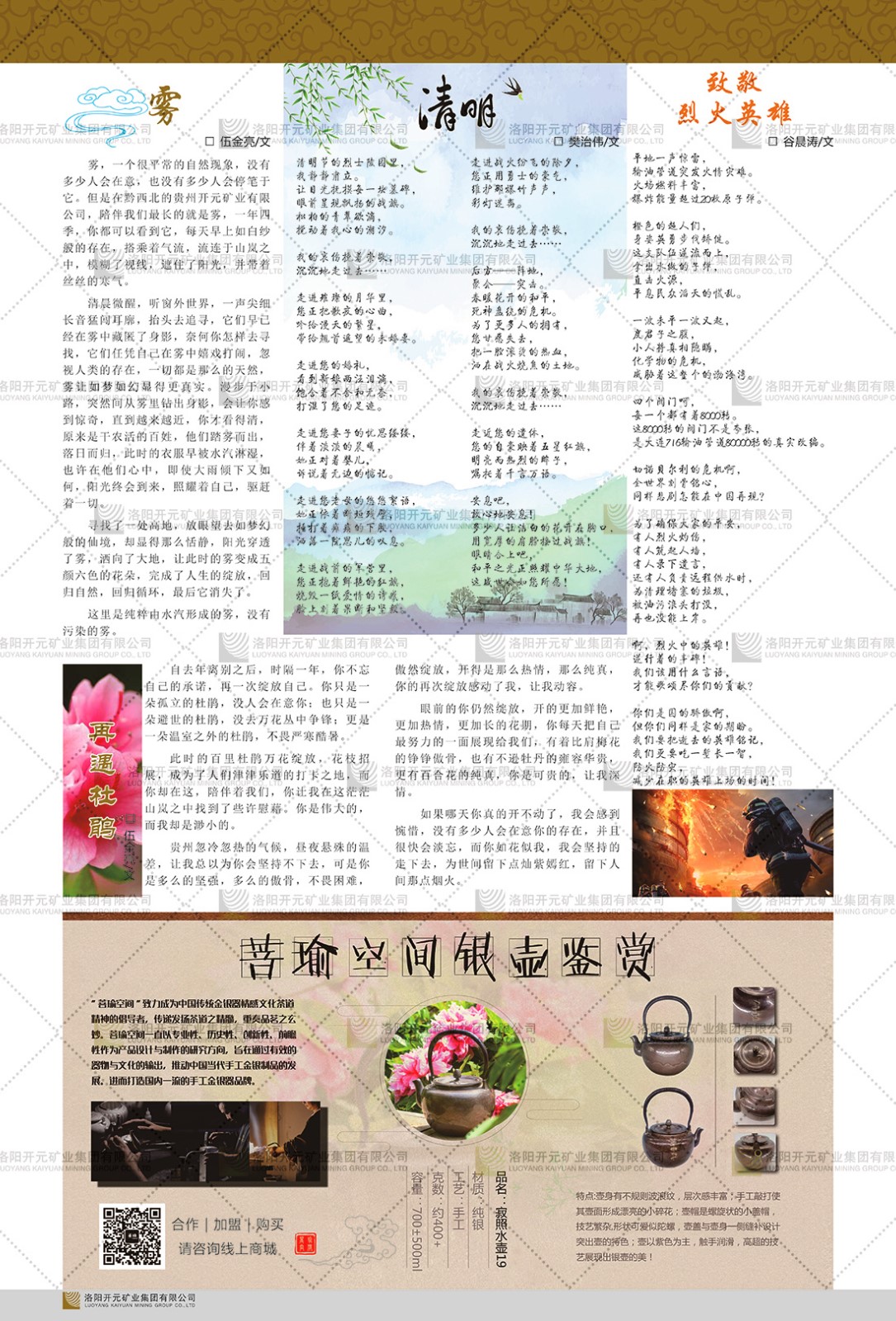 洛陽開元礦業(yè)集團有限公司簡介洛陽開元礦業(yè)集團有限公司,始成立于2006年,位于洛陽市開元大道269號。集團旗下共有十余家全資子公司,業(yè)務涉及有色金屬礦山開發(fā)、礦產(chǎn)品購銷與進出口貿(mào)易、房地產(chǎn)開發(fā)、文化藝術、企業(yè)管理與咨詢、資本投資等多個領域。2024年,集團公司銷售總額達7.8億元。民建河南省委委員、民建河南省委企業(yè)委副主任、民建洛陽市委委員、企業(yè)委主任、洛陽民建企業(yè)家協(xié)會會長許明月是公司創(chuàng)始人,現(xiàn)任洛陽開元礦業(yè)集團有限公司董事長。在礦業(yè)領域,洛陽開元礦業(yè)集團擁有多家實力雄厚的子公司:貴州開元礦業(yè)有限公司探、采礦權面積共11.33平方公里;興??h銅鑫礦業(yè)有限公司探礦權面積8.76平方公里,礦山資源潛力巨大;2021年,開元集團與盧氏中科礦業(yè)有限公司開展戰(zhàn)略合作。盧氏中科礦業(yè)有限公司專注于有色金屬的浮選、加工和銷售,擁有強大的技術支撐平臺,是集探、采、選、冶、研為一體的中大型綜合礦業(yè)企業(yè)。目前,盧氏中科王家河1000噸選礦廠已成功投產(chǎn),雙河金礦、柳關欒盧鉛鋅礦相繼順利開工,樓房銀礦與圪老灣鉛鋅礦的深部探礦重大突破,標志著礦山版圖取得重大進展,為開元集團后續(xù)發(fā)展奠定了堅實基礎。在文化傳媒領域,洛陽市明月美術館通過豐富多樣的藝術展覽、學術研討和公共教育活動,努力打造一個集展覽、交流、教育、研究為一體的綜合性藝術平臺。此外,在金融投資領域,開元集團旗下的北京明峰資本管理有限公司專注于投資具有高增長潛力的優(yōu)秀企業(yè),特別是高科技、新能源、環(huán)保等新興產(chǎn)業(yè),為客戶提供個性化的資產(chǎn)配置服務。在做好企業(yè)經(jīng)營的同時,開元集團始終不忘企業(yè)的社會責任和家國情懷,以突出的愛心公益事跡,開展了一系列公益慈善活動:“民建林”公益事業(yè)通過“思源基金”“幫幫公益”線上公益平臺,與眾多愛心人士籌措資金20余萬元;資助541名貧困大學生共計270余萬元,推進“數(shù)字助力——河南AI人才培養(yǎng)”;捐款10萬元,馳援京津冀、黑龍江洪水地質災害……公司于2017年底被洛陽市慈善總會評為“洛陽慈善風云榜——十大愛心集體”。洛陽開元礦業(yè)集團有限公司秉承持續(xù)發(fā)展理念,憑借多年來良好的企業(yè)信譽與經(jīng)營業(yè)績,與全國多家企業(yè)建立了良好合作關系,受到社會各界的一致好評,多次榮獲“納稅標兵”“先進企業(yè)”“招商引資模范企業(yè)”等榮譽稱號。回望來時路,開元人勠力同心,以“闖”的精神和“創(chuàng)”的勁頭,一路披荊斬棘,踏過千山萬水;展望新未來,開元人凝心聚力,不執(zhí)于“舊”,無畏于“新”,秉承“勇于跨越,追求卓越”的企業(yè)精神,乘著國家高質量發(fā)展新征程的東風,跨過高山,越過大海,向著集團多元化、國際化的目標,逐夢遠航,跨越前行!